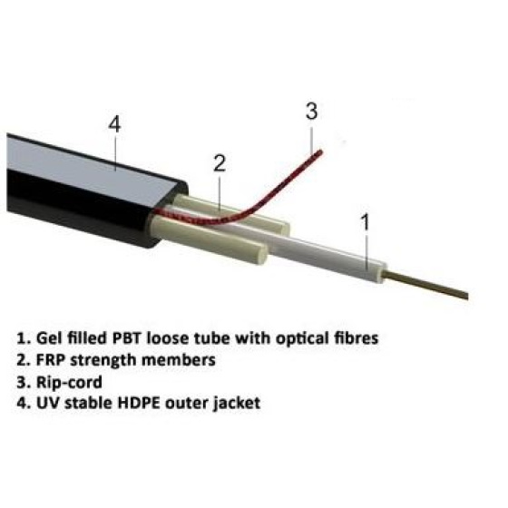 *Kabel je určen pro vnější použití k zavěšení nebo lze uložit do pískového lože. Vlákno G657A1 *Tahová odolnost 1550N *Odolnost v tlaku 4000N/10cm *Min poloměr 180mm *Rozsah teplot instalační -5°V +40°C *Provozní -40°C +70°C *Životnost 30let