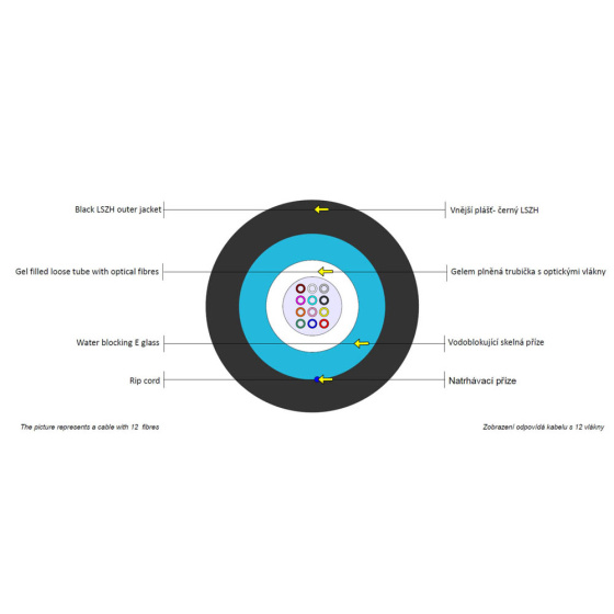 12vl., 50/125um, kabel gelový UNIV, LSOH, CLT, OM3 barevně rozlišená vlákna Obchodní informace: