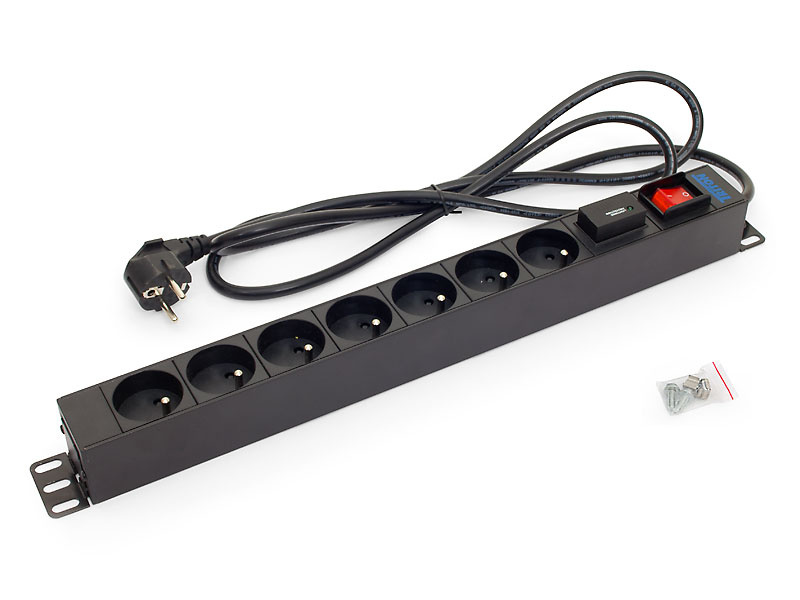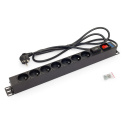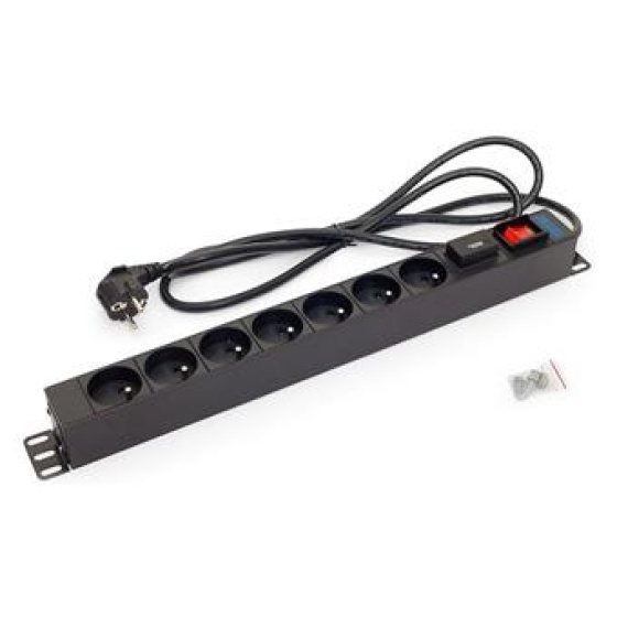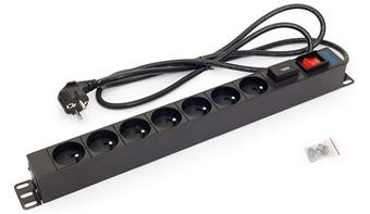 19“ rozvodný panel 1U; 7 x zásuvka podle ČSN, max. 16 A; kabel 3 x 1,5 mm, 2 m + zástrčka univerzál CZ-DE max. 16 A; bleskojistka; podsvícený vypínač; RAL 9005;