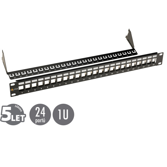 Patch panel Solarix s označením SX24M-0-STP-BK-UNI je univerzální neosazený patch panel, který je určený pro 24 stíněných i nestíněných keystonů Solarix SXKJ-xx-yyy-BK-SA a SXKJ-xx-yyy-BK-NA. Modulární provedení patch panelu umožňuje pohodlnou instalaci a díky vyvazovací liště, která je součástí dodávky panelu, i přehledné vyvázání a pevné uchycení datového kabelu přímo k tělu panelu. Tento patch panel je vybaven zemnícím drátem, který umožňuje jeho propojení se zemněním rozvaděče. Barva patch panelu i vyvazovací lišty je černá, velikost v datovém rozvaděči je 1U. V případě potřeby je možné zaslepit volné porty panelu záslepkou SXKJ-0-BK. Rozměry otvorů pro keystone jsou u tohoto modulárního panelu Solarix 19,5±0,1 mm x 14,8±0,1mm (tj. dle ČSN EN 60603-7). Součástí balení je 4x M6 montážní sada, 24x vyvazovací pásek a 1x zemnící drát. Panel je celokovový.