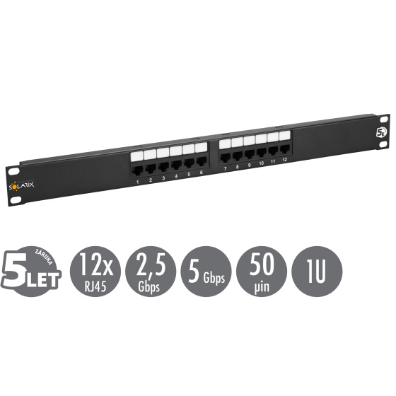 Popis 19" patch panel Solarix 12 x RJ45 CAT5E UTP 150 MHz čierny 1U SX12-5E-UTP-BK