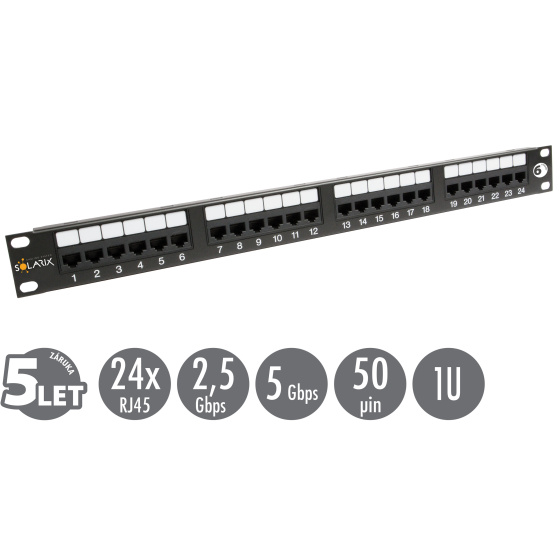 19" patch panel Solarix 24 x RJ45 CAT6 UTP 350 MHz čierny 1U SX24-6-UTP-BK