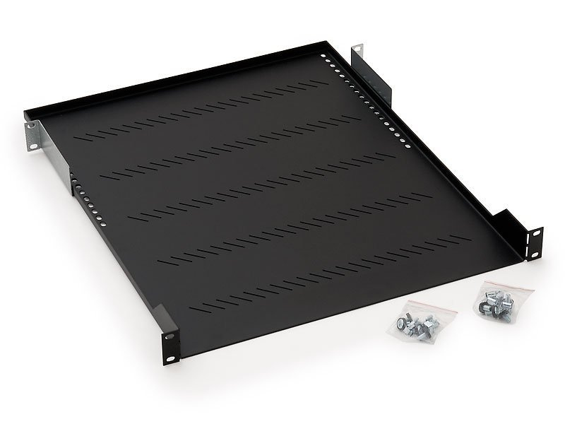 19" polička perforovaná 1U/850mm, max.nosnost 150kg,integrované podpěryČerná barvaPŘÍBALŠroub M6 x 1