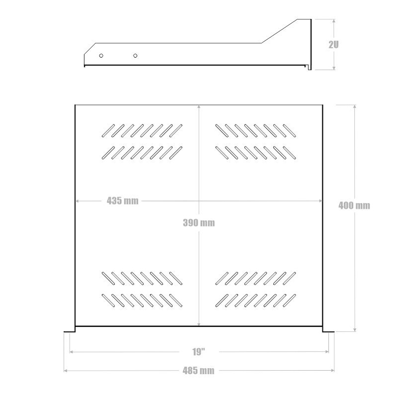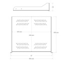 Polička s perforací 19" 2U 400 mm - 19" nízkoprofilová police 400 mm s uchycením 2U je vhodná pro umístění do 19" datového rozvaděče s hloubkou 600 mm a hlubšší. - Perforované tělo police umožňuje proudění vzduchu. - Tato police se instaluje pouze na přední vertikální lišty datového rozvaděče. TECHNICKÉ VLASTNOSTI Celková hloubka police: 400 mm Výška uchycení v rozvaděči:: 2U Rozměr úložné plochy police: (š) 435 mm x (h) 390 mm Max. nosnost police: 30 kg Rozměry: (v) 100 mm x (š) 510 mm x (h) 420 mm Hmotnost: 2,32kg Součástí balení je příbal pro uchycení v rozvaděči: 4x klecová matice M6, 4x šroub M6