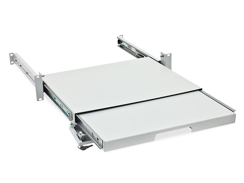 Výsuvná uzamykatelná 19´´ police 2U pro klávesnici a myš, uzamykatelná, hloubka zasunuté police je 371,5 mm