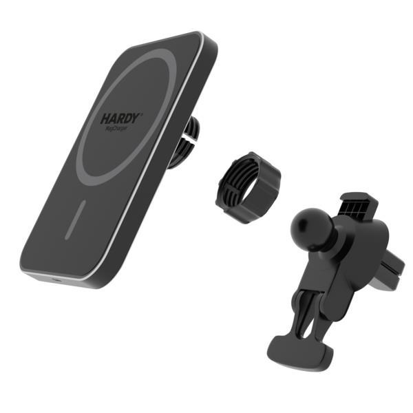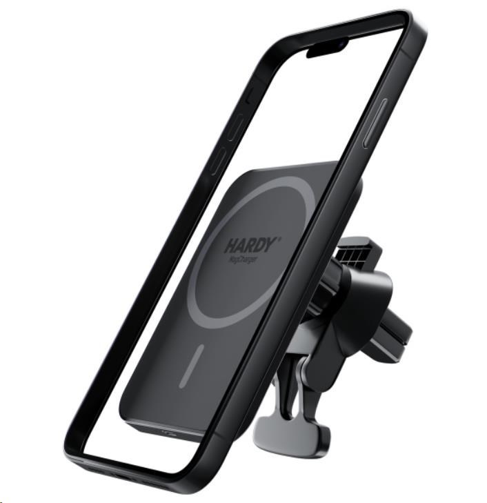 Táto high-tech nabíjačka je určená pre smartfóny iPhone s vstavanou technológiou MagSafe. Modul magnetickej nabíjačky zapadá do vnútorného magnetického kruhu telefónu a zabezpečuje, že iPhone tesne prilieha k nabíjaciemu povrchu. Magnety držia telefón pevne na mieste a chránia ho pred pádmi alebo zmenou polohy počas jazdy. Nastaviteľný držiak zvyšuje stabilitu držiaka nabíjačky na držiaku ventilačného otvoru vo vozidle. Takže aj na hrboľatých cestách je telefón v bezpečí. Stabilný a pohodlný – tak váš iPhone cestuje s nabíjačkou HARDY® MagCharger!