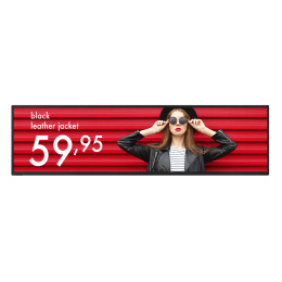 42palcový ultra širokoúhlý model MultiSync® BT421 je vynikající volbou pro digitální prezentaci v maloobchodě, dopravních uzlech, restauracích rychlého občerstvení a ve všech ostatních stísněných veřejných prostorech. *Prostorově efektivní displej *Odolný a spolehlivý *Jednoduché přizpůsobování obsahu *Cenově výhodné a flexibilní přehrávání médií *Vynikající čitelnost v prostředích s jasným osvětlením *Připravený na provoz v kritických podmínkách 24 hodin denně 7 dnů v týdnu *Úsporná správa zařízení Typ obrazovky: VA Podsvícení: s přímým LED podsvícením Úhlopříčka [palce]: 42 Rozlišení: 1920 x 480 Rozteč bodu [mm]: 0.542 Poměr stran: 16:4 Aktivní plocha obrazovky (W x H) [mm]: 1,039.7 x 259.9 Jas [cd/m2]: 700 Kontrast: 4000:1 Odezva [ms]: 8 (grey-to-grey) Pozorovací úhly (Horizontál/Vertikál): 178 horizontal / 178 vertical (typ. contrast ratio 10:1) Konektory: *Digitální video vstup: 2 x DVI-D (with HDCP) *Ovládání vstupu :LAN 100Mbit; RS232 *Digitální video výstup: 1 x DVI-D Spotřeba [W]: 50 transport; 75 (max.) Stand By režim [W]: < 2 (Networked Standby) Montáž na zeď: VESA 200 x 100 (FDMI); 4 holes; 400 x 100 (FDMI); M6 Podporování orientace: Na výšku; Na šířku Barva: černá Rozměry (ŠxVxH mm): 1 059,9 x 288,9 x 64,7 Hmotnost [kg]: 9.3 Záruka: 36 měs.