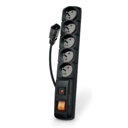 Vlastnosti: *5 zásuvek s ochranným kolíkem *Podsvícený síťový vypínač *Signalizace napájení *Automatická pojistka s časovým zpožděním *Dětská pojistka na každé zásuvce *4 možné směry uspořádání síťového přívodu *Samozhášecí plastové pouzdro *Ergonomický design *Černá barva *Délka 1.5m *Přípojný kabel osazený počítačovým konektorem C14 *Vhodná pro připojení do UPS