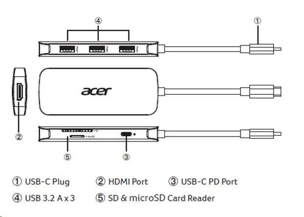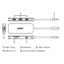Popis ACER Dokovací stanice 7in1 Type-C dongle, 1x HDMI, 3x USB-A 3.2 Gen1, 1x SD 3.0, 1x microSD, 1x USB-C, silver