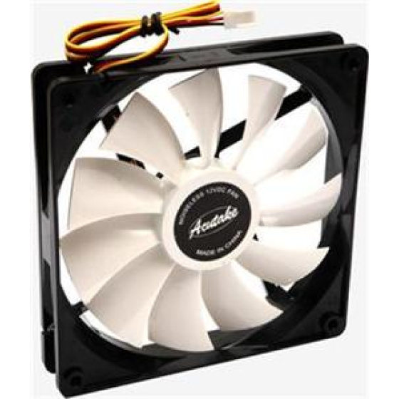 Luxusní ACUTAKE 140mm supertichý ventilátor s bílými lopatkami a se specialními Enhaced FDB ložisky o rozměrech 140x140x25mm, otáčky 1000 +-10% za minutu, 12V DC, hlučnost jen 14,5dB/A, elegantní retailové balení se šroubky a antivibračními podložkami v ceně.