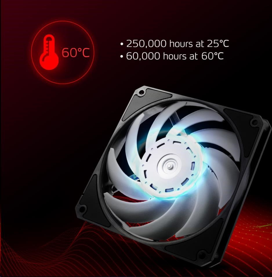 Ventilátor XPG VENTO PRO 120 PWM má overenú hodnotu MTTF (stredný čas do poruchy) 250 000 hodín pri 25?alebo 60 000 hodín pri 60? okolitého prostredia, vďaka čomu je ideálny pre ťažšie zaťaženie, napr.g. priestorovo obmedzenejšie stavby s vyššími vnútornými teplotami. Ventilátor XPG VENTO PRO 120 PWM využíva výhody vysoko presných dvojitých ložísk a dokáže pracovať ticho a stabilne pri veľkom rozsahu teplôt.