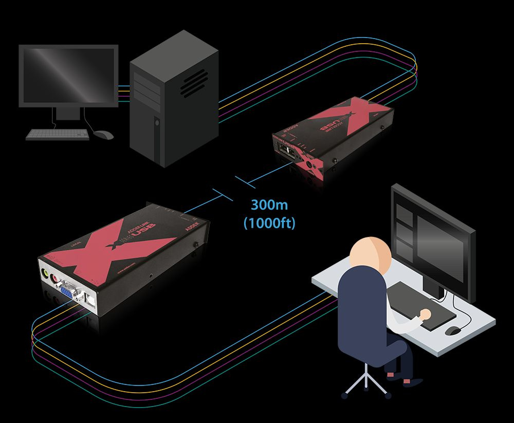 Adder’s next generation USB, video and audio extender, distributing uncompressed data to deliver sharp, bright, high resolution video images and high quality audio to single user consoles up to 300m/1000ft over a single CATx cable.