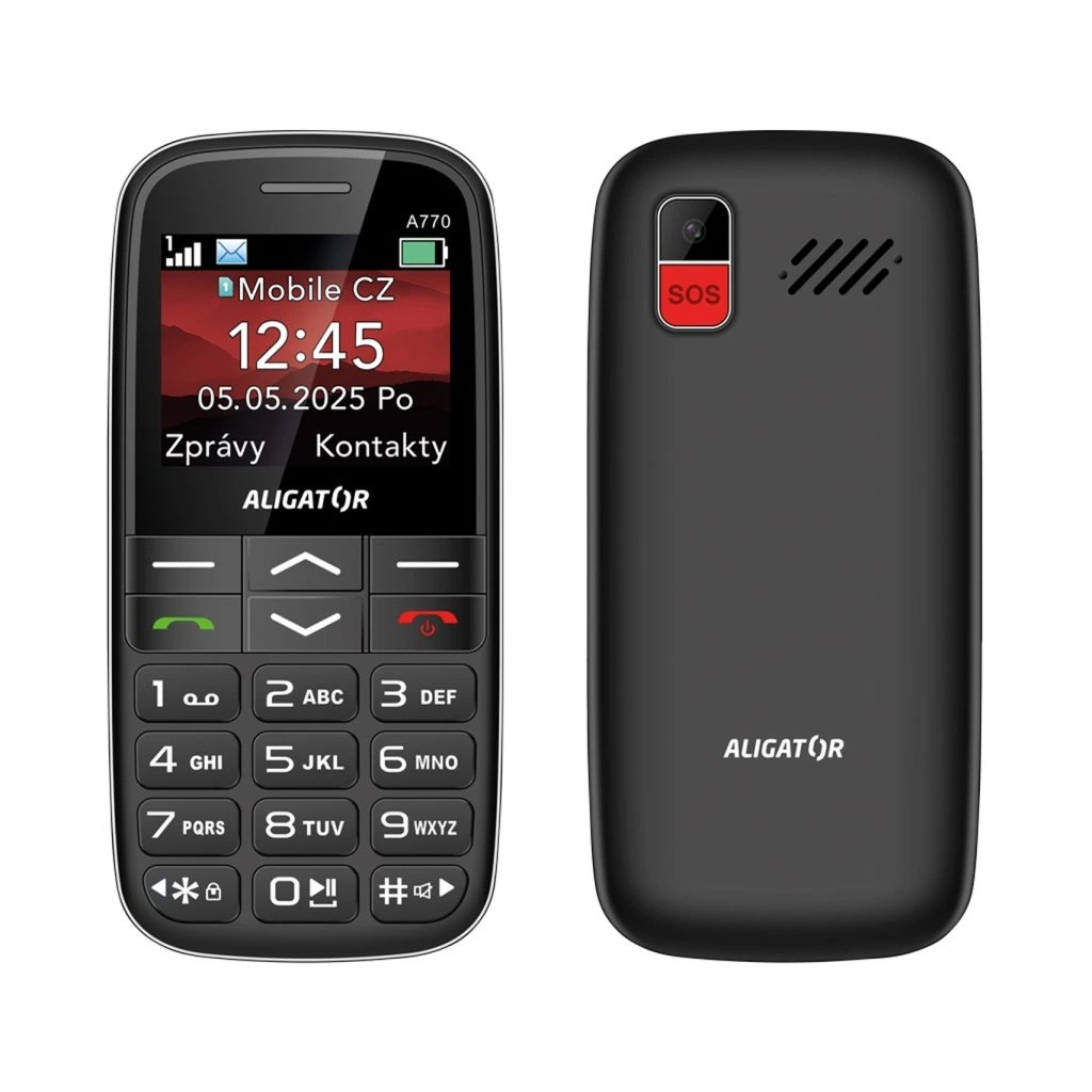 Obsah balení: Telefon Aligator A770, nabíjecí stojánek, návod k použití (bez nabíječky)