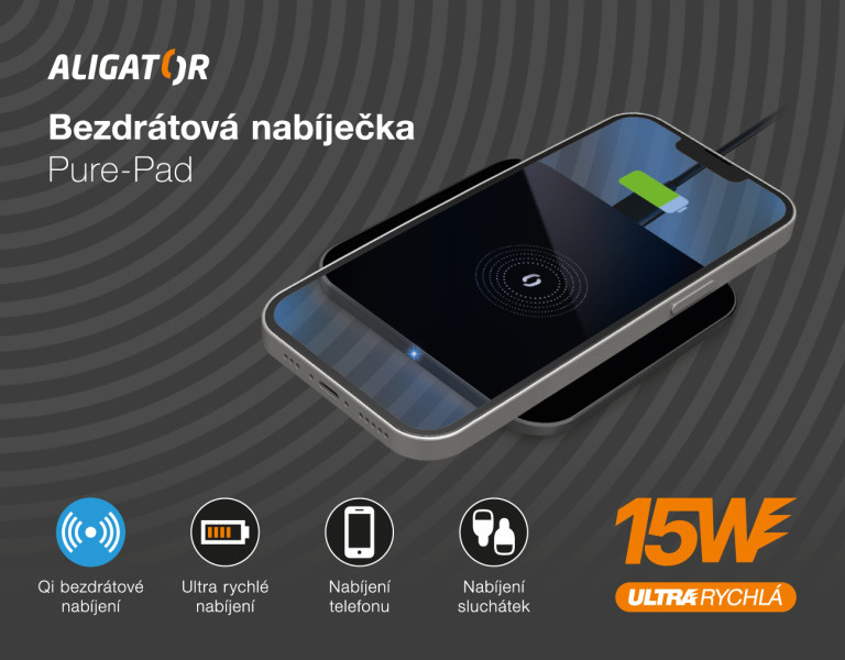 Bezdrátová nabíječka Aligator Pure-Pad Prémiová nabíječka s podporou rychlého bezdrátového nabíjení o výkonu 15W. Hravě a bezdrátově nabije Váš mobilní telefon nebo TWS sluchátka.