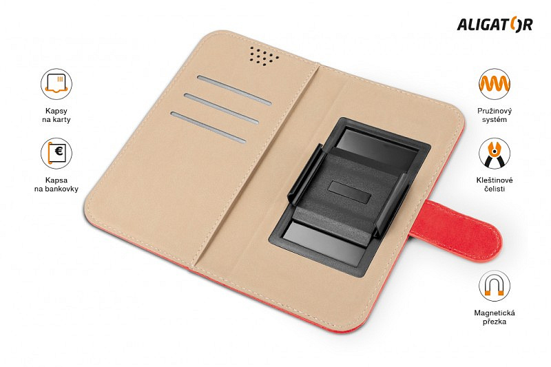 * Univerzální pouzdro * Zavírání pomocí magnetické přezky * Přítlačné posuvné čelisti pro uchycení mobilního telefonu * Otvory pro reproduktor k pohodlnému vyřizování hovorů * Přihrádky na karty nebo vizitky * Kapsa na bankovky * Tenké provedení * Kvalitní zpracování * Elegantní design * Snadné uchycení a vyjmutí mobilního telefonu * Použití fotoaparátu bez nutnosti vyjmout telefon z pouzdra s pomocí výsuvného systému