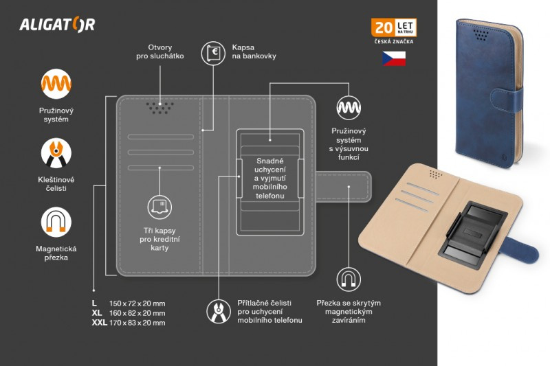 * Univerzální pouzdro * Zavírání pomocí magnetické přezky * Přítlačné posuvné čelisti pro uchycení mobilního telefonu * Otvory pro reproduktor k pohodlnému vyřizování hovorů * Přihrádky na karty nebo vizitky * Kapsa na bankovky * Tenké provedení * Kvalitní zpracování * Elegantní design * Snadné uchycení a vyjmutí mobilního telefonu * Použití fotoaparátu bez nutnosti vyjmout telefon z pouzdra s pomocí výsuvného systému