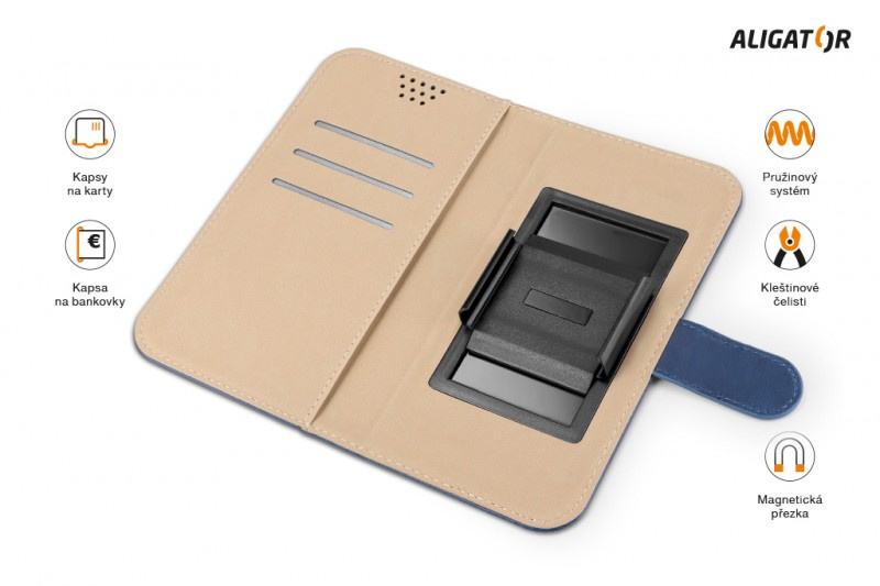 * Univerzální pouzdro * Zavírání pomocí magnetické přezky * Přítlačné posuvné čelisti pro uchycení mobilního telefonu * Otvory pro reproduktor k pohodlnému vyřizování hovorů * Přihrádky na karty nebo vizitky * Kapsa na bankovky * Tenké provedení * Kvalitní zpracování * Elegantní design * Snadné uchycení a vyjmutí mobilního telefonu * Použití fotoaparátu bez nutnosti vyjmout telefon z pouzdra s pomocí výsuvného systému