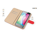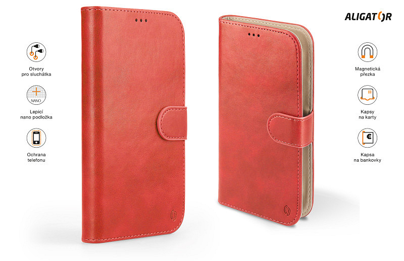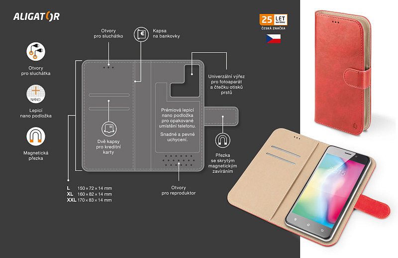 Dokonale propracovaný design, tenké provedení, přihrádka na kartu nebo vizitky, podélná kapsa na bankovky, zavírání pomocí magnetické přezky, snadné uchycení mobilního telefonu pomocí prémiové lepicí nano podložky, která je určena pro opakované umístění telefonu.