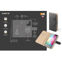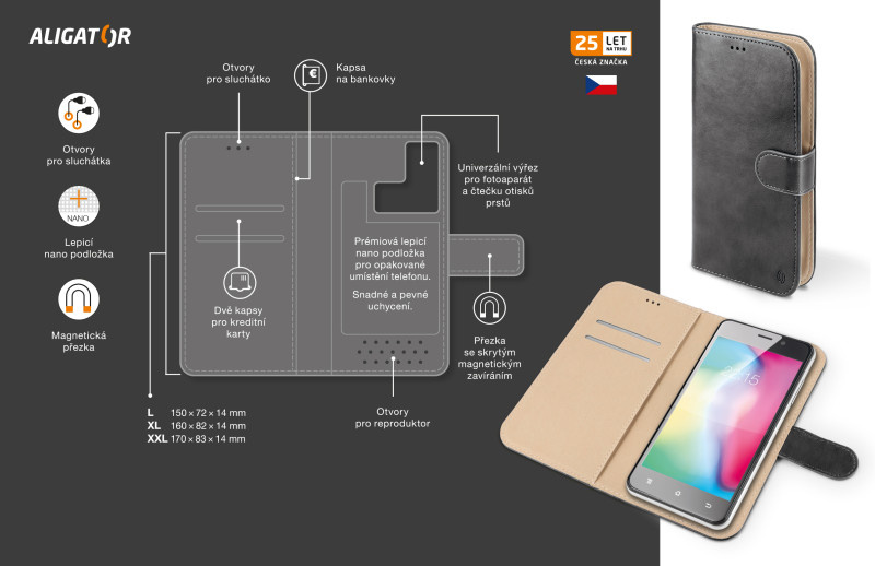 Dokonale propracovaný design, tenké provedení, přihrádka na kartu nebo vizitky, podélná kapsa na bankovky, zavírání pomocí magnetické přezky, snadné uchycení mobilního telefonu pomocí prémiové lepicí nano podložky, která je určena pro opakované umístění telefonu.