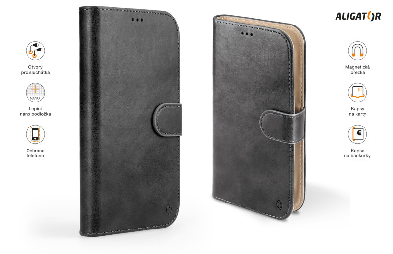 Dokonale propracovaný design, tenké provedení, přihrádka na kartu nebo vizitky, podélná kapsa na bankovky, zavírání pomocí magnetické přezky, snadné uchycení mobilního telefonu pomocí prémiové lepicí nano podložky, která je určena pro opakované umístění telefonu.