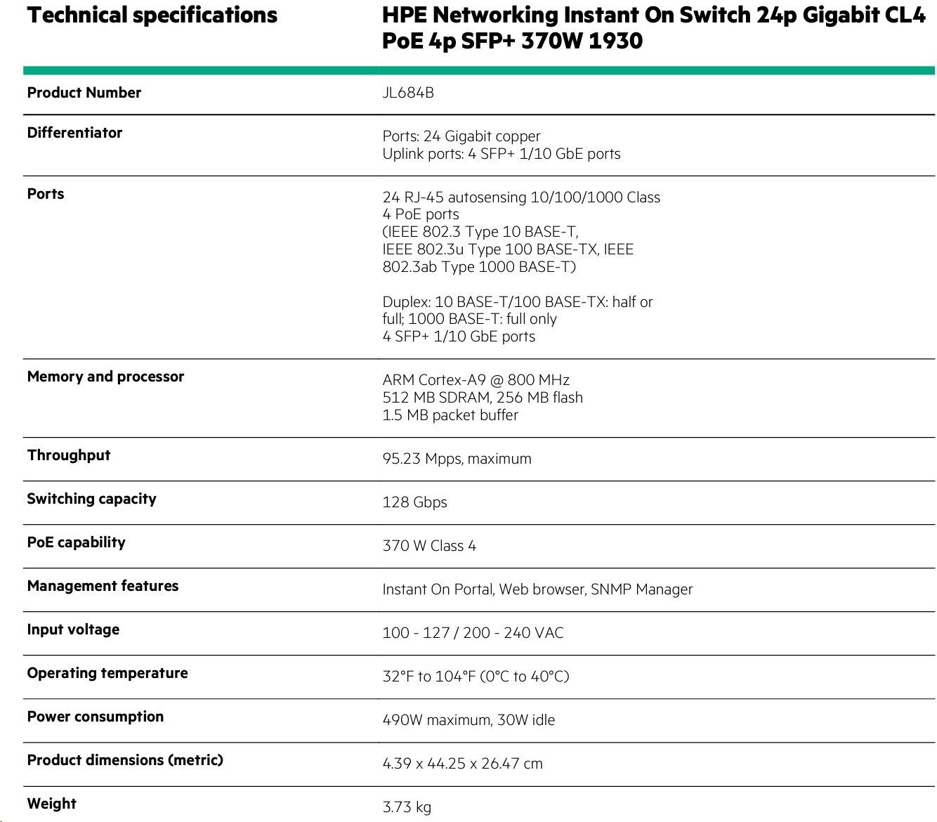 HPE Networking Instant On Switch 24p Gigabit CL4 PoE 4p SFP+ 370W 1930 (JL684B)