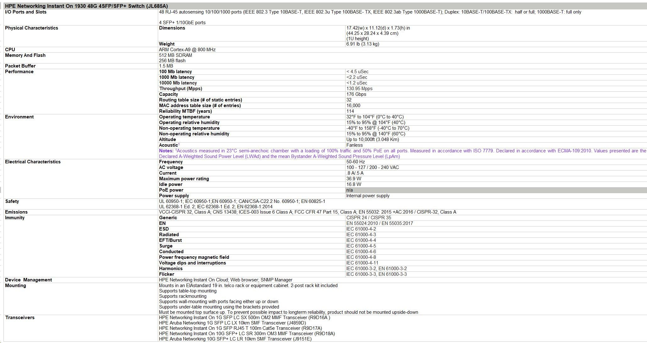 | Notes: 1Acoustics measured in 23°C semi-anechoic chamber with a loading of 100% traffic and 50% PoE on all ports. Measured in accordance with ISO 7779. Declared in accordance with ECMA-109:2010. Values presented are the Declared A-Weighted Sound Power Level (LWAd) and the mean Bystander A-Weighted Sound Pressure Level (LpAm) | ||