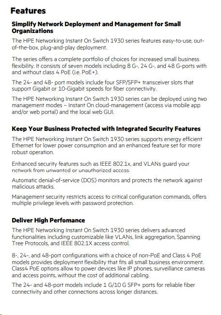 Popis HPE Networking Instant On Switch 8p Gigabit CL4 PoE 2p SFP 124W 1930 (JL681)