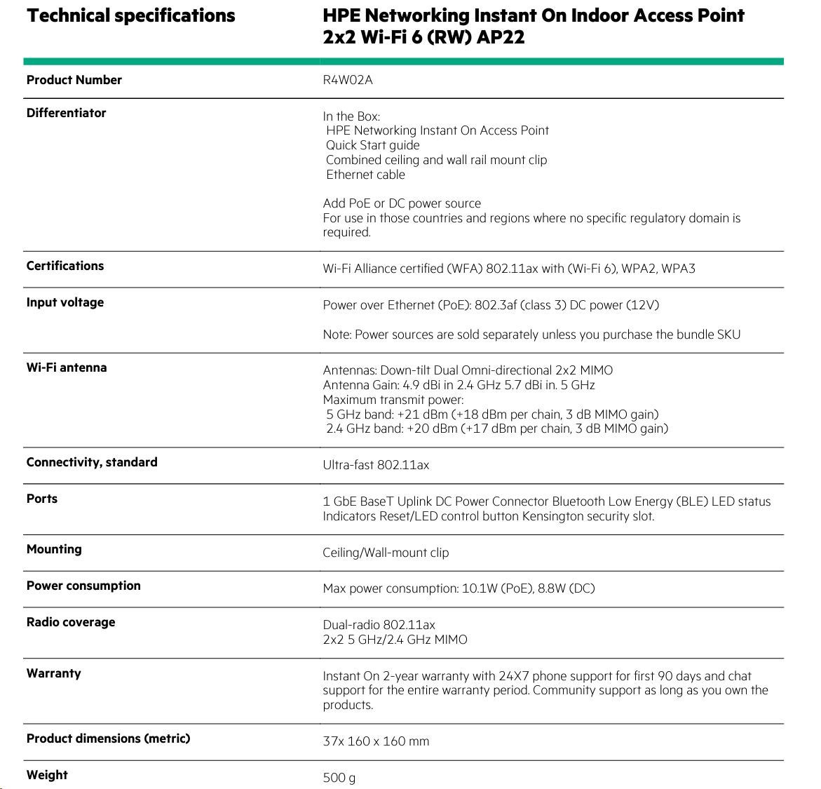 Aruba Instant On AP22 (RW) Access Point. The Aruba Instant On AP22 provides high-performance concurrent 2.4 GHz and 5 GHz Wi-Fi 6 (802.11ax) features with MIMO radio (2 x 2 at 2.4 GHz, 2 x 2 at 5 GHz) while supporting older 802.11a / b / g / n / ac wireless services.
