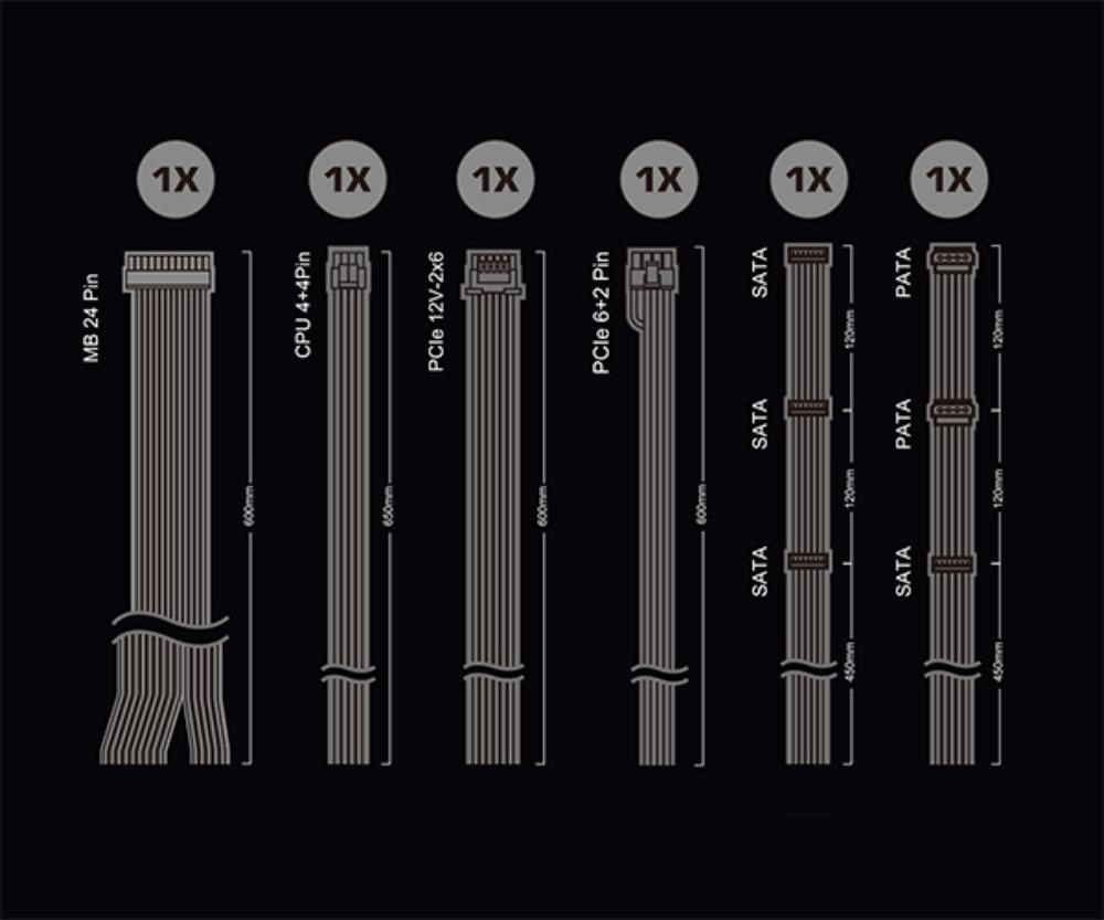 PCIe 8-pin, SATA 15-pin, 8pin CPU 1x, Molex, PCIe 6-pin, PCIe 16-pin Gen5