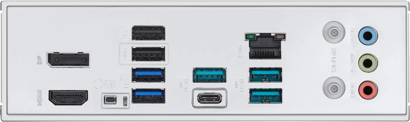 Porty na zadním panelu: 1 x USB 10Gbps port (1 x USB Type-C®) 3 x USB 10Gbps porty (3 x Type-A) 2 x USB 5Gbps porty (2 x Type-A) 2 x USB 2.0 porty (2 x Type-A) 1 x DisplayPort 1 x HDMI™ port 1 x Wi-Fi modul 1 x Realtek 2.5Gb Ethernet port 3 x audio konektory 1 x tlačítko BIOS FlashBack