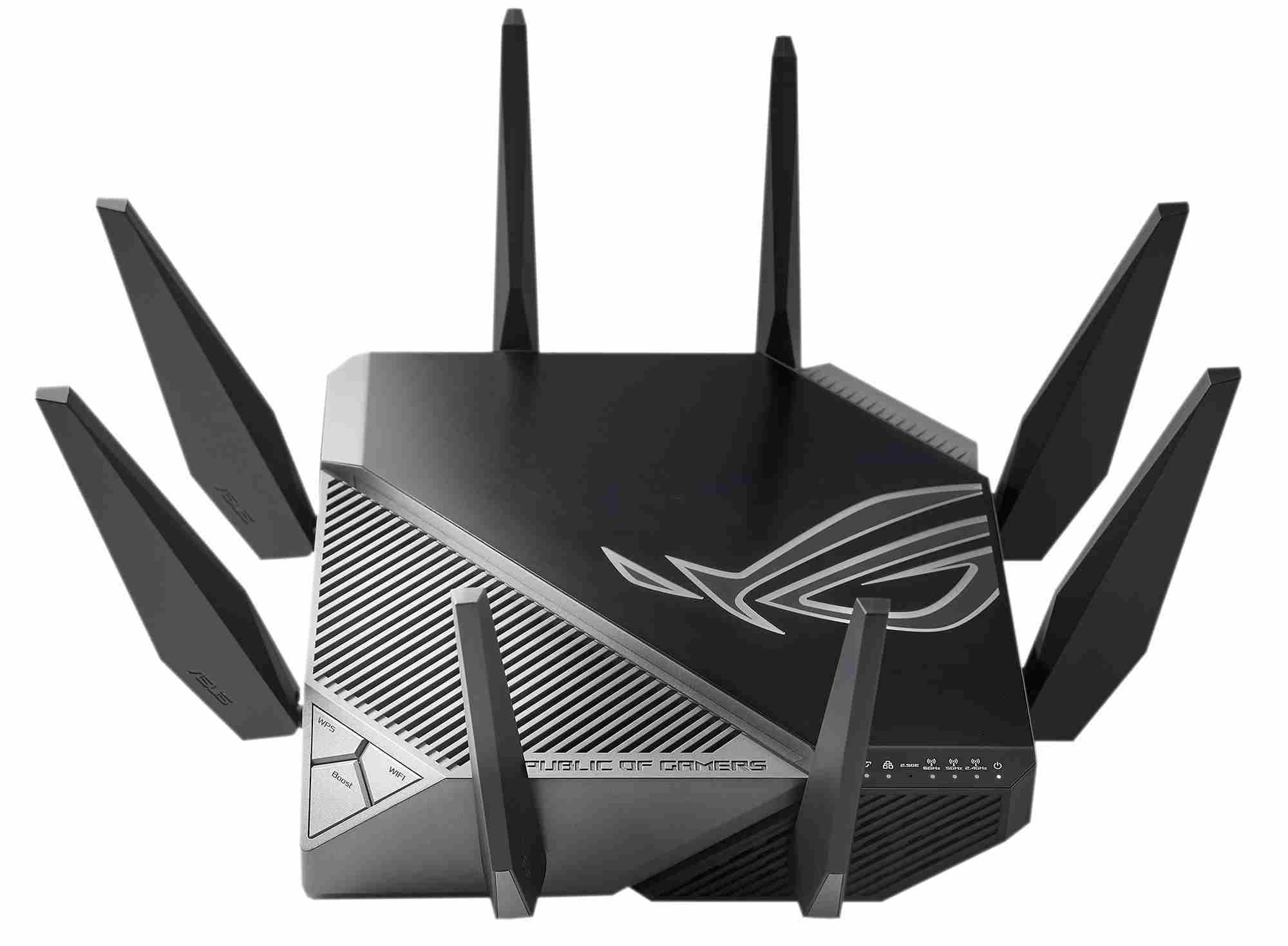 ROG Rapture GT-AXE11000 Trojpásmový herný router GT-AXE11000 WiFi 6E (802.11ax), nové pásmo 6 GHz, 2.port 5G WAN/LAN, kompatibilita s PS5, agregácia WAN, VPN Fusion, trojúrovňová akcelerácia hier, bezplatné zabezpečenie siete a podpora AiMesh Štandard WiFi novej generácie - prvý trojpásmový router WiFi 6E na svete zvyšuje rýchlosť až na 11 000 Mb/s. Nové pásmo 6 GHz - širšie kanály a vyššia kapacita prinášajú vyšší výkon, nižšiu latenciu a menej rušenia. 2.5G WAN/LAN Port - Všetka sieťová prevádzka prechádzajúca cez 2.port 5G má najvyššiu prioritu a 2.port 5G tak môže naplno využiť potenciál WiFi 6. Výkon vďaka špičkovej technológii - štvorjadrový procesor, pokročilý systém chladenia a optimalizovaný dizajn antény posúvajú výpočtové možnosti na úplne novú úroveň. Trojúrovňová akcelerácia hry - zrýchlenie herných dát na každej zastávke od zariadenia až po herný server. RJ45 pre Gigabits BaseT pre WAN x 1, RJ45 pre Gigabits BaseT pre LAN x 4, RJ45 pre 2.5G BaseT pre WAN/LAN x 1 ROG Rapture Wifi 6 802.11ax Trojpásmový gigabitový herný router Wifi 6 802.11ax 1148Mbps (2.4G) Wifi 6 802.11ax 4804Mbps (5GHz) Wifi 6E 802.11ax 4804Mbps (6GHz) OFDMA + MU-MIMO, 1024 QAM, trojúrovňová akcelerácia hier, osvetlenie Aura RGB, ROG Boost Key, 2.5G Multi-Gigabit Gaming Port, WiFI Radar a Zero Wait DFS, AiProtection Pro, VPN Fusion Adaptive QoS, Bandwidth control, AiMesh, ASUS Roter APP (ROG theme)..