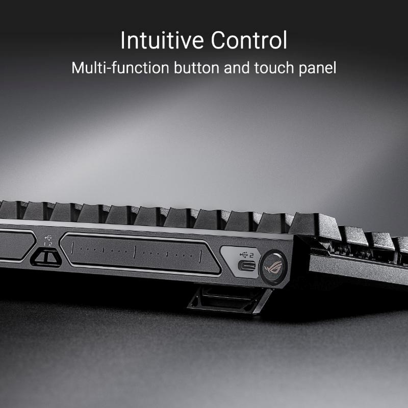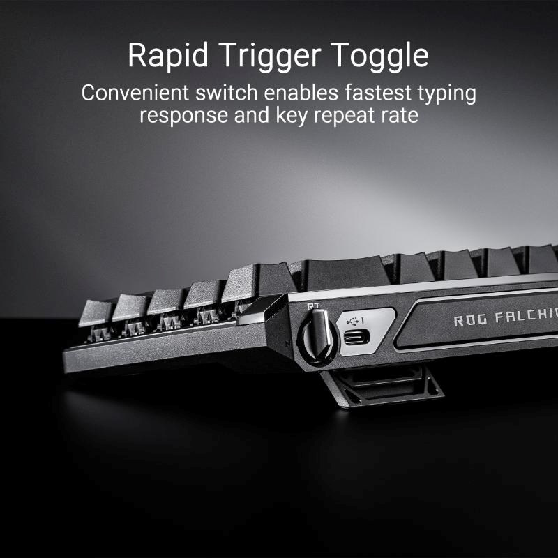 ROG Falchion Ace HFX 65% analógová herná klávesnica s magnetickými spínačmi ROG HFX, prepínač Rapid Trigger, režim Speed ??Tap, interaktívny dotykový panel, obnovovacia frekvencia 8000 Hz, päťvrstvové tlmenie a silikónové tesnenie, duálne porty Type-C, tri uhly sklonu a krycie puzdro