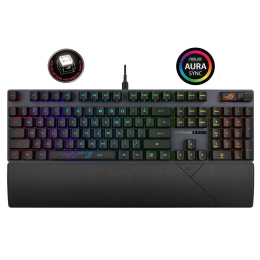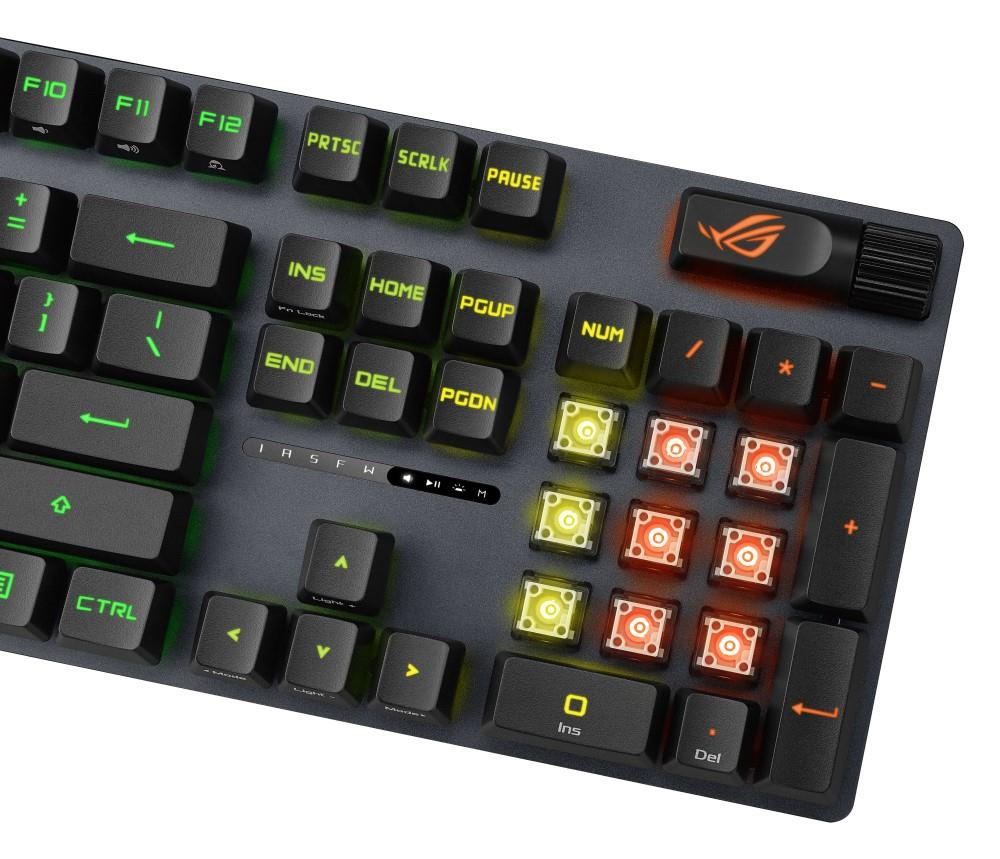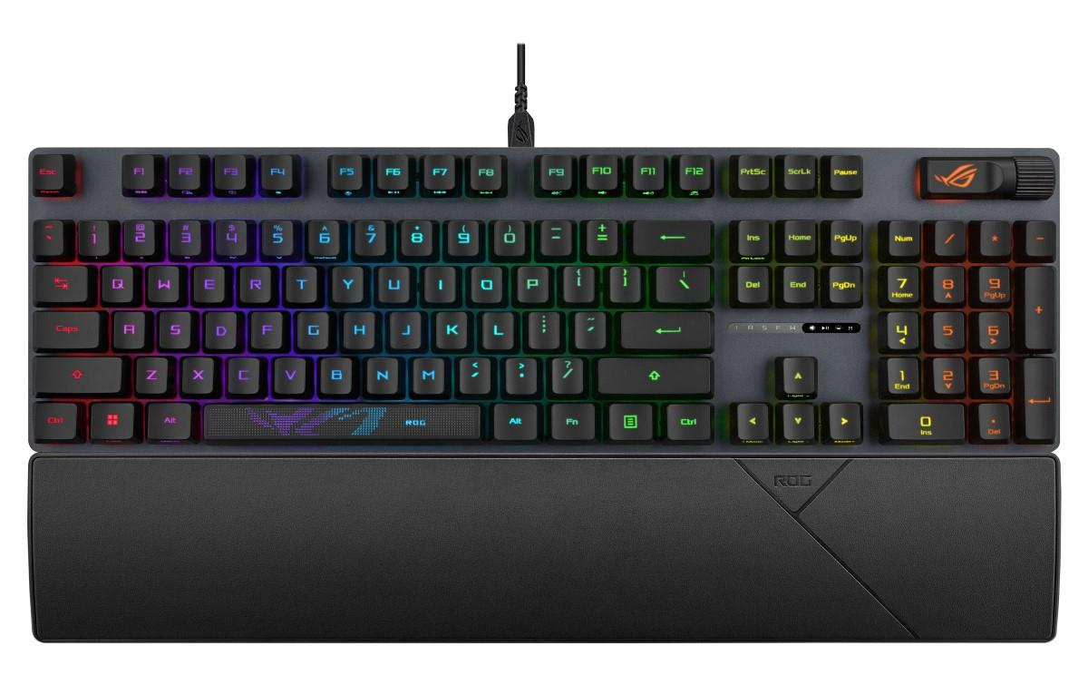 Herná klávesnica ROG Strix Scope II s predpripravenými mechanickými spínačmi ROG NX Red, penou na tlmenie hluku, dvojitými krytkami kláves PBT alebo ABS s UV povrchovou úpravou, klávesovými skratkami na streamovanie, multifunkčnými ovládacími prvkami, tromi uhlami sklonu a opierkou zápästia
