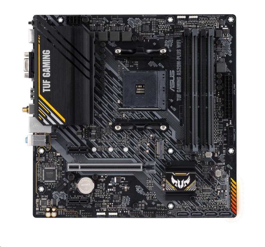 AMD A520 (Ryzen AM4) micro ATX gaming motherboard with M.2 support, 802.11ac Wi-Fi, DisplayPort, HDMI, D-Sub, USB 3.2 Gen 1 ports, SATA 6 Gbps, and AURA Addressable Gen 2 headers.