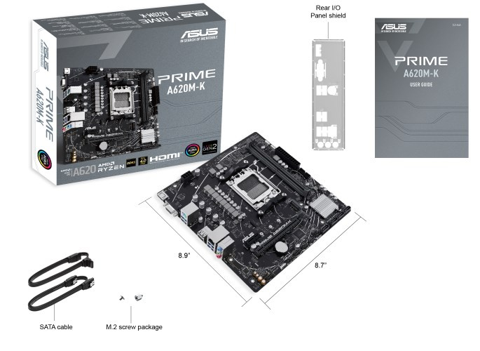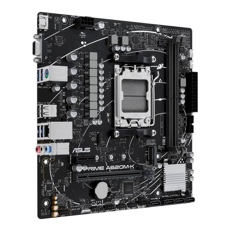 AMD A620 micro-ATX motherboard, DDR5, PCIe 4.0 Graphics card and PCIe 4.0 M.2 support, HDMI™, VGA, USB 3.2 Gen 1 Type-A, SATA 6 Gbps, Two-Way AI Noise Cancellation, Aura Sync