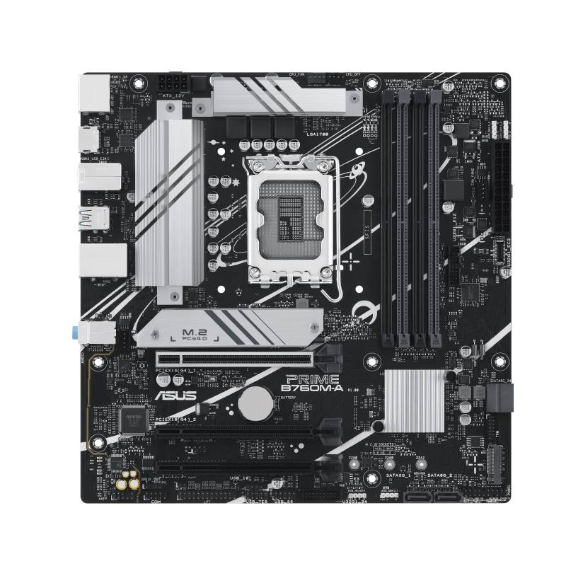 Intel® B760 (LGA 1700) mATX motherboard with PCIe 4.0, DDR5, two M.2 slots, Realtek 2.5Gb Ethernet, DisplayPort, Dual HDMI™, SATA 6 Gbps, rear USB 3.2 Gen 2, front USB 3.2 Gen 1 Type-C®, Aura Sync