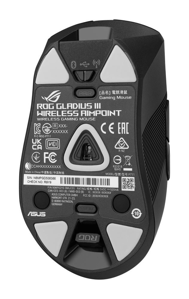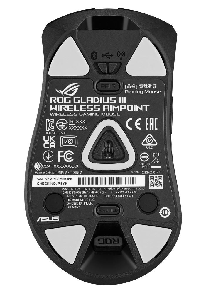 • Push-Fit Switch Socket II: Vymeniteľný dizajn spínača pre jednoduché prispôsobenie; Gladius III Wireless AimPoint obsahuje mikrospínače ROG a je kompatibilný s ďalšími 3pinovými mechanickými a 5pinovými optickými mikrospínačmi