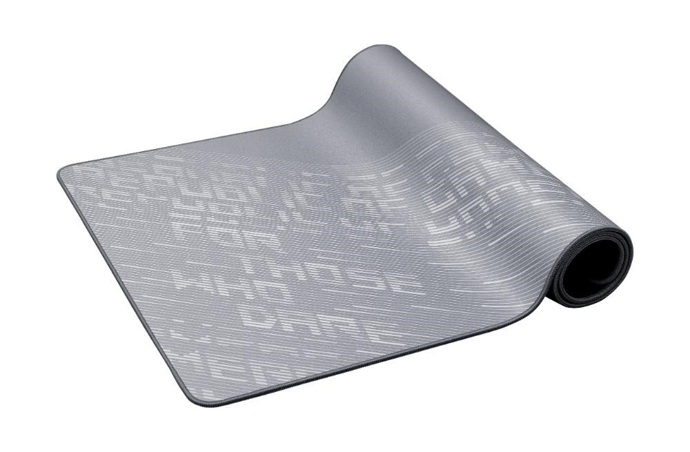 ROG Scabbard II Arctic Gray XXL je veľká herná podložka pod myš s povrchom odolným voči vode, oleju a prachu, s plochými prešívanými okrajmi proti odieraniu a protisklzovou gumou dole.