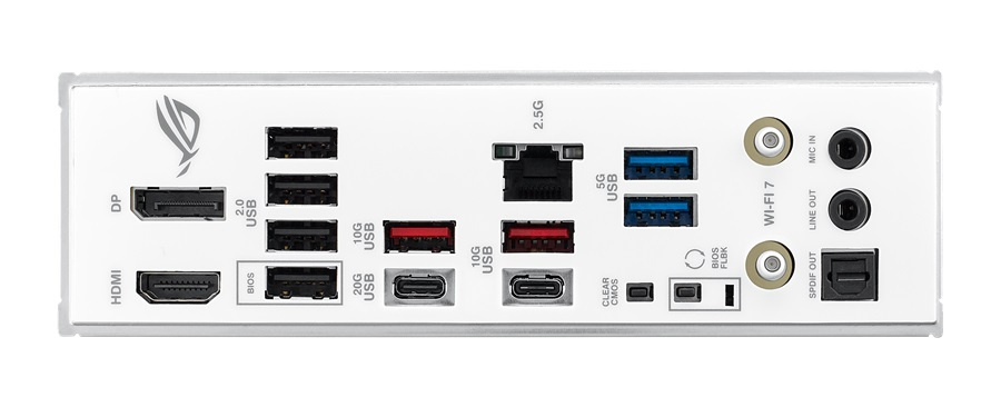 Vstupy/výstupy zadního panelu: *1 x USB4® (20Gbps) port (1 x USB Type-C®) *3 x USB 10Gbps ports (2 x Type-A + 1 x USB Type-C®) *2 x USB 5Gbps ports (2 x Type-A) *4 x USB 2.0 ports (4 x Type-A) *1 x DisplayPort *1 x HDMI™ port *1 x Wi-Fi module *1 x Intel® 2.5Gb Ethernet port *2 x Audio jacks *1 x Optical S/PDIF out port *1 x BIOS FlashBack™ button *1 x Clear CMOS button