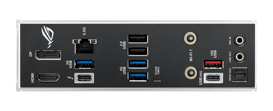 Vstupy/výstupy zadního panelu: *1 x Thunderbolt™ 4 port (1 x USB Type-C®) *1 x USB 20Gbps port (1 x USB Type-C®) *1 x USB 10Gbps ports (1 x Type-A) *3 x USB 5Gbps ports (3 x Type-A) *2 x USB 2.0 ports (2 x Type-A) *1 x DisplayPort *1 x HDMI™ port *1 x Wi-Fi module *1 x Intel® 2.5Gb Ethernet port *2 x Audio jacks *1 x Optical S/PDIF out port *1 x Clear CMOS button
