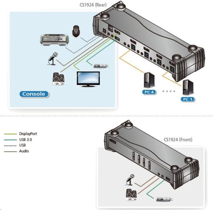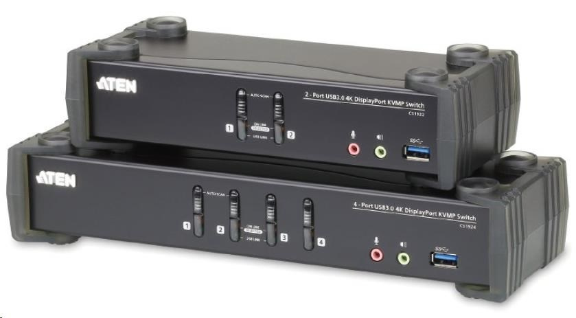 Aten CS1924 4-portový 4K DisplayPort KVMP 3.0 prepínač umožňuje jednému používateľovi zdieľať štyri pripojené počítače pomocou jednej klávesnice, myši a monitora.