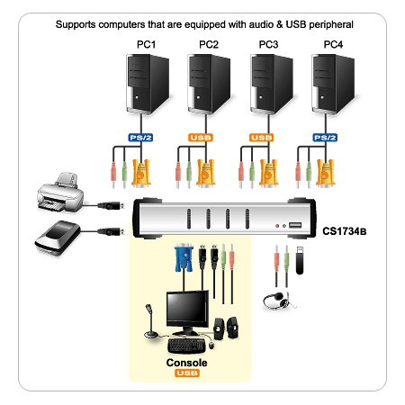 *4-port KVM přepínač s USB 2.0 a 2.1 surround sound audio podporou *1 konzole ovládá čtyři počítače a další 2 USB zařízení *vestavěný 2-port USB 2.0 hub *USB 2.0 kompatibilní *Dual interface - podpora počítačů s PS/2 nebo USB klávesnicí a myší *2.1 surround sound system *přiložená redukce USB-PS/2 *nezávislé přepínání KVM a audia *video až 2048 x 1536; DDC2B *podpora širokoúhlých modů obrazu *výběr počítače tlačítkem, OSD, nebo hotkey *multiplatformní podpora Windows 2000/XP/Vista, Linux, Mac, and Sun *Console mouse port emulation / bypass feature supports full mouse driver and multifunction mice *Display Emulation Technology - stores the console monitor's EDID (Extended Display Identification Data) to optimize display resolution *Complete keyboard emulation for error-free booting *Sun/Mac keyboard support and emulation *Auto Scan Mode for monitoring all computers *LED Display for easy status monitoring *Easy installation – no software required *Firmware upgradeable