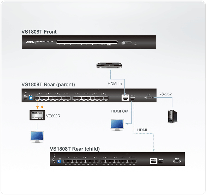 Rozbočovač Aten VS-1808T je nejrychlejším a nejefektivnějším způsobem jak dostat HDMI multimediální obsah a HDCP informace ze vstupu signálu (počítač, přehrávač....) až na 8 zobrazovacích HDMI zařízení (monitor, projektor...) současně.