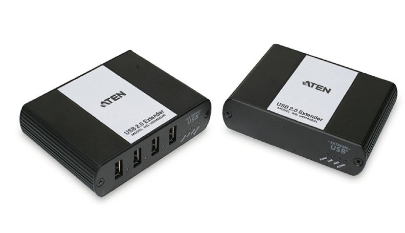 ATEN USB 2.0 prodlužka s 4portovým hubem do 100m po Cat5 kabelu Zařízení umožňuje prodloužit signál USB 2.0 až do vzdálenosti 100m. K prodloužení se používá Cat5 kabel (není součástí balení), zařízení je ukončeno 4 portovým USB hubem, který umožní připojit až 4 zařízení najednou.