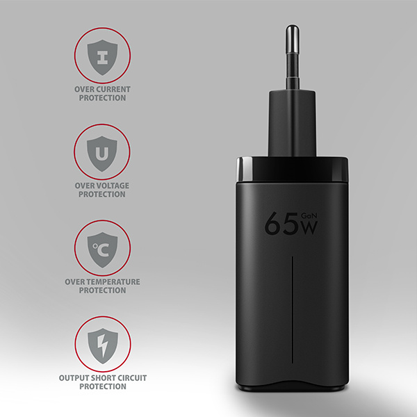 Pokročilý systém ochran na výstupu nabíjecího adaptéru chrání nabíjené zařízení před poškozením. Funkce nabíječky také zajistí rozpoznání nabíjeného zařízení a zvolení optimální rychlosti a průběhu nabíjení.