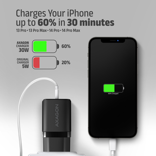 Popis AXAGON ACU-PQ30 Síl nabíjačka do siete 30W, 2x port (USB-A + USB-C), PD3.0/PPS/QC4+/SFC/AFC/Apple