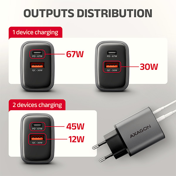 Popis AXAGON ACU-PQ67 GaN nabíjačka do siete 67W, USB-A + USB-C, PD3.0/PPS/QC4+/SFC2.0/Apple