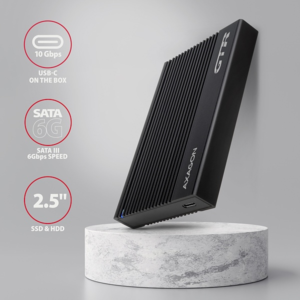 Rebrovaný hliníkový externý box AXAGON EE25-GTR RIBBED s rozhraním USB-C 10Gbps určený pre 2,5" pevné disky SATA alebo SSD. Spoľahlivé pripojenie k počítaču umožňuje obojstranný konektor USB-C na krabici spolu s dodávaným káblom USB-C na > USB-A a adaptérom USB-A na > USB-C.