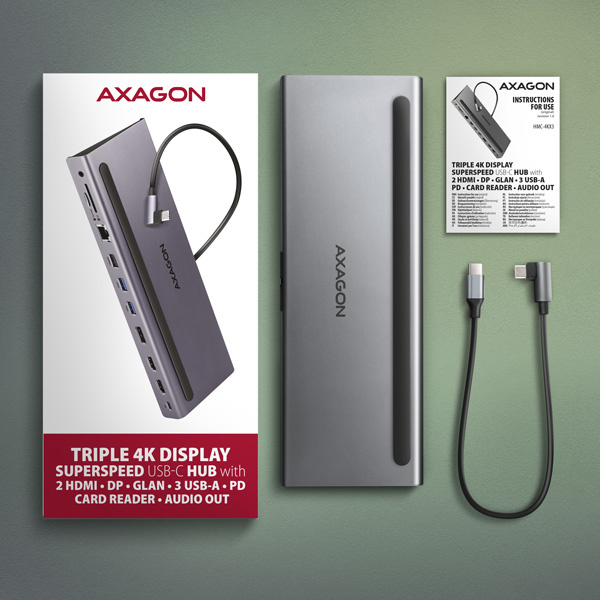 Popis AXAGON HMC-4KX3 USB 5Gbps hub, 3x USB-A, 2x HDMI, DP, RJ-45, SD/microSD, audio, PD 100W, kábel 40cm