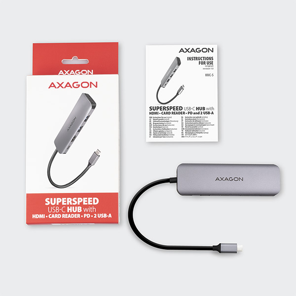 Popis AXAGON HMC-5, USB 3.2 Gen 1 hub, porty 2x USB-A, HDMI, SD/microSD slot, PD 100W, kábel USB-C 20cm